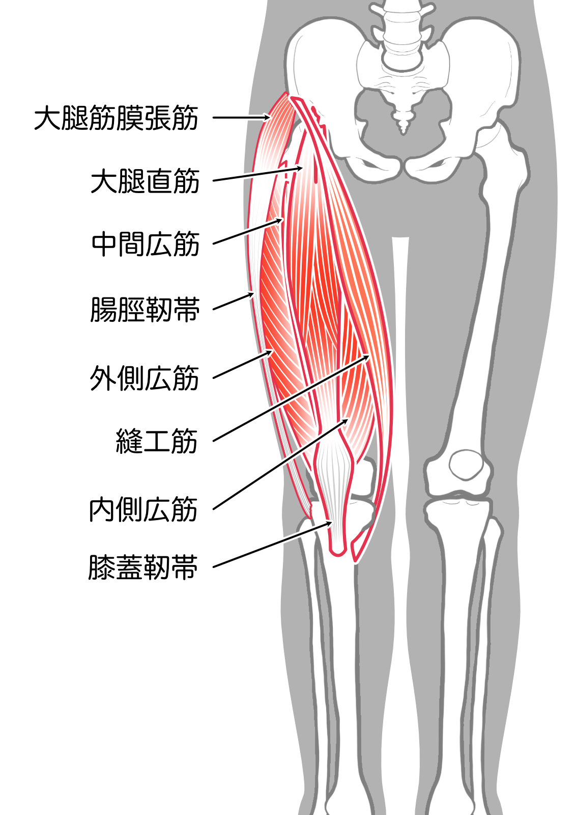 下半身をチェックしてみたところ、お尻の横の筋肉(大腿筋膜張筋)と太ももの横の筋肉(外側広筋)、それに太もも裏のハムストリング(大腿二頭筋、半腱様筋、半膜様筋)が傷んでいることが確認できました。