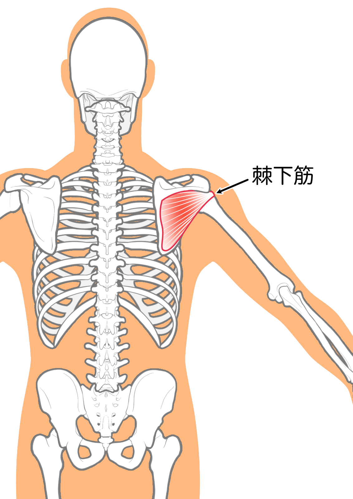 肩関節の前の筋肉(三角筋等)は主に腕を前に挙げるときに働く筋肉で、肩甲骨の表面に付いている筋肉(棘下筋)は腕を外側に捻る筋肉です。