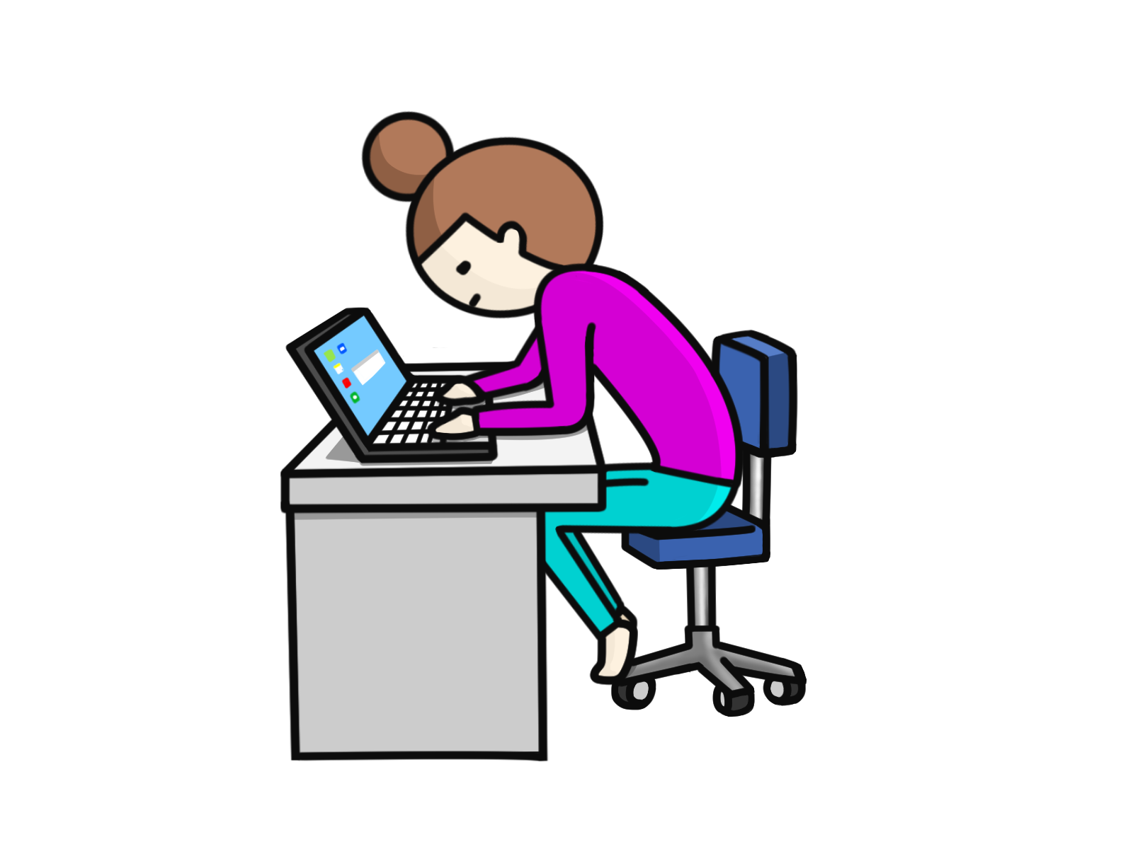 根本的な原因が仕事中の前屈み姿勢である可能性が高まったため、椅子の高さを適宜調整し前屈みにならないよう指導しました。