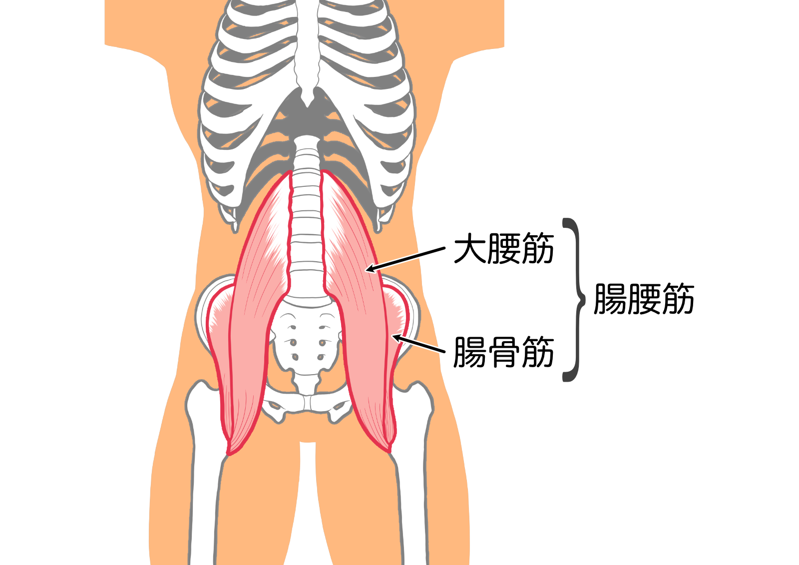 ※皆さんも「腸腰筋」という名前を聞かれることがあると思いますが、これは「腸骨筋」と「大腰筋」という主に足を上げる働きをする2つのインナーマッスル(身体の深いところにある深層筋)の名前の一文字ずつを取って名付けたものです。