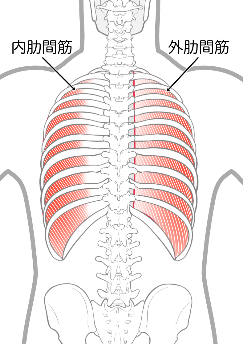 検査してみると、一般的な〝ギックリ腰″や〝背中痛”の場合に傷んでいることの多い腰の筋肉や背筋は傷んでなく、実際に傷んでいたのは、仙骨上の筋肉と肋骨間にある「肋間筋」でした。