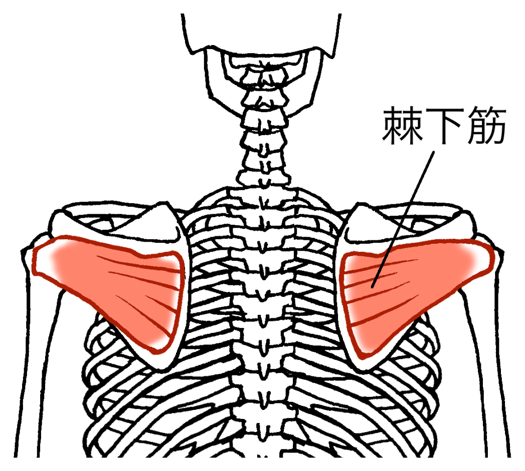 この筋肉(棘下筋)は肩甲骨の上から腕の上部につながっていて、腕を外側に捻る働きをする筋肉です。