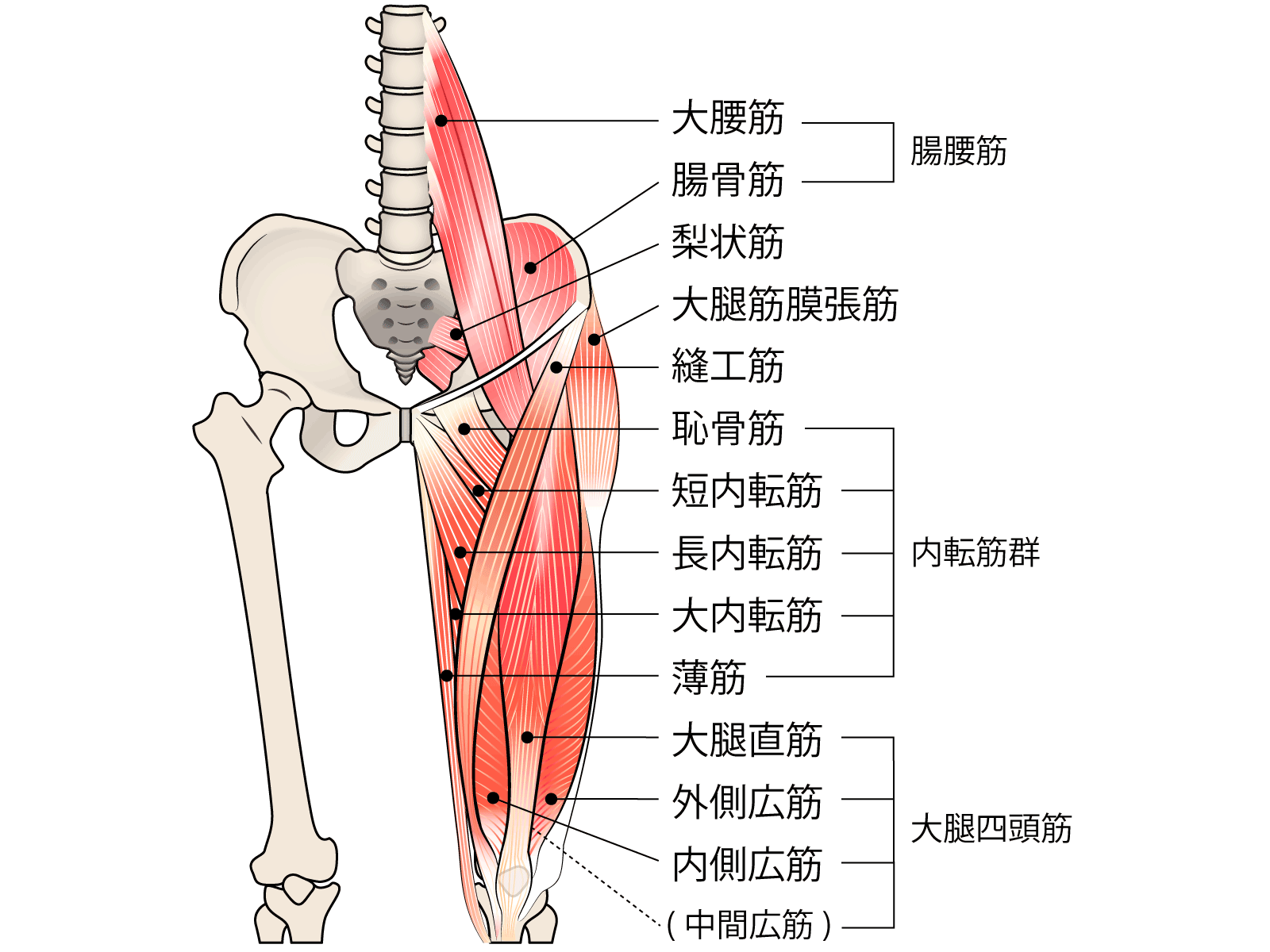 原因は、普段は行わない長距離運転が長期間(約1ヶ月)続いたことで「腸骨筋」や「大腿四頭筋」を傷めたものと考えられます。