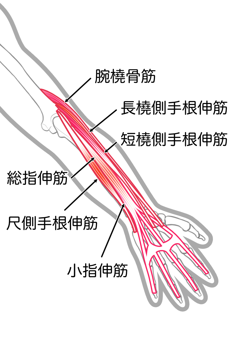 右腕をチェックしたところ、手首を反らせる筋肉(手根伸筋)と指を反らせる筋肉(指伸筋)がかなり傷んでいることと、それに手首を手前に曲げる筋肉(手根屈筋)も少々傷んでいることが確認できました。